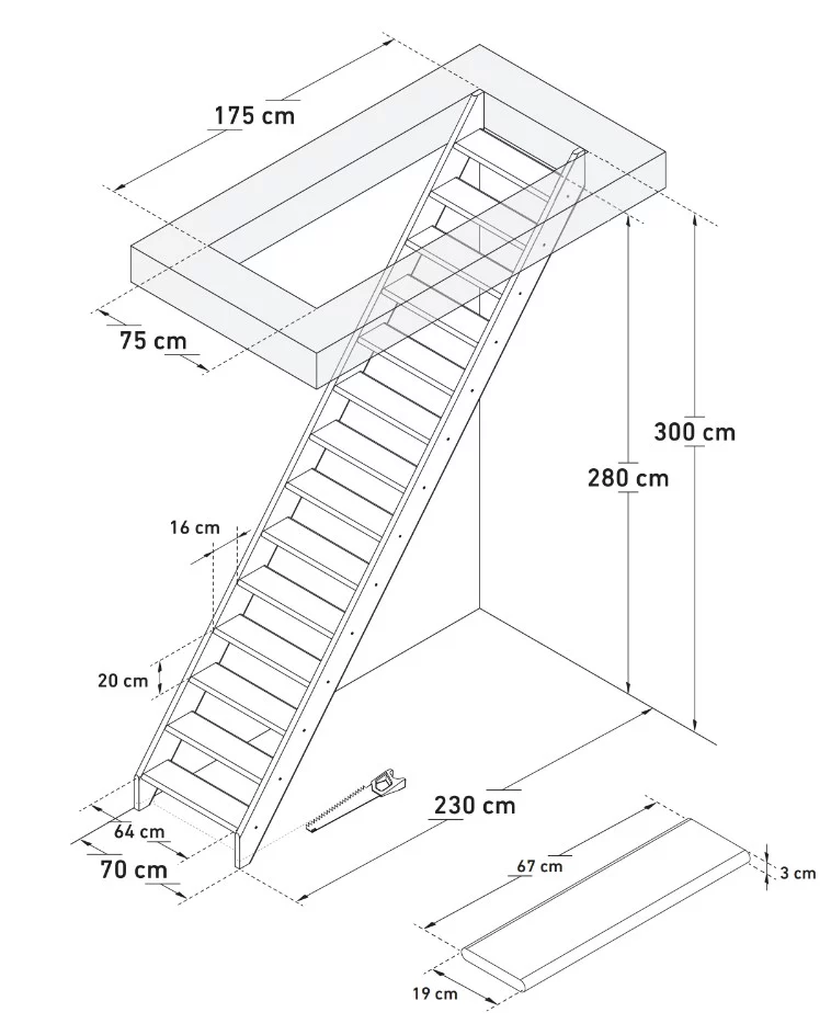 De uitval van deze trap is 230 CM.