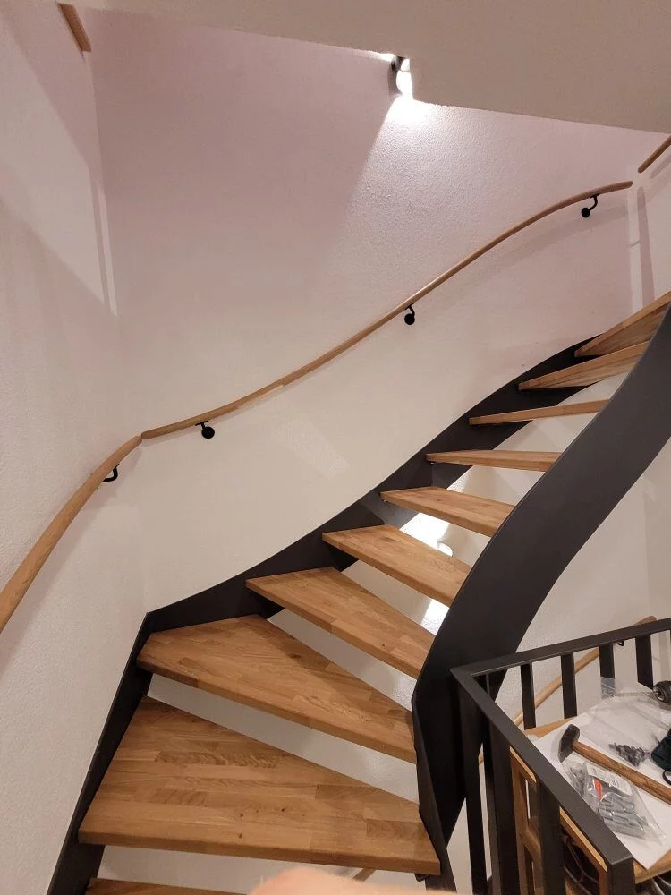 Voor deze klant in Weert hebben we gebogen trapleuningen geleverd, passend bij een buigingen van de trapbomen. De klant was