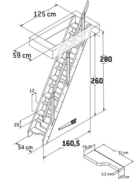 Deze steektrap is een gemakkelijke en simpele oplossing om op een vliering of zolder te komen. Daarnaast kan deze trap natuurlijk ook voor een kelder gebruikt worden. Deze trap is zeer ruimtebesparend doordat de trap minder ver de ruimte in komt. Dit is mogelijk door de tredes die op elkaar inspringen. De trap heeft een sparing ruimte nodig van 130 CM lang. De trap zelf is 280 CM hoog en 60 CM breed(zonder leuning). De trap is eventueel in hoogte inkortbaar. Dit houdt in dat de trap dan ook een kleinere ruimte nodig heeft zodra deze ingekort wordt.