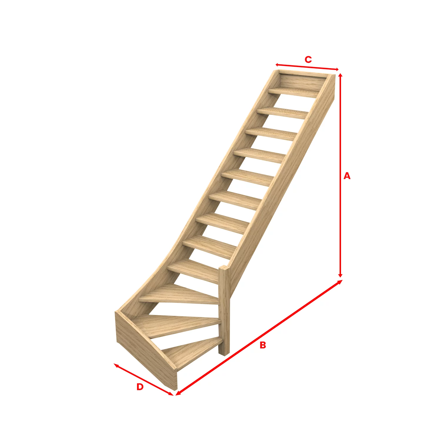 Vul je het keuzemenu in? Wees extra aandachtig bij het invullen van de maten. De tekening laat zien waar je welke maat in het menu moet kiezen. Maar naast de grondvorm, draairichting en de afmetingen, zijn er nog meer aspecten om te bepalen. Wordt het een open of gesloten onderkwart trap? Bij een gesloten trap zijn er stootborden aanwezig, bij een open trap niet. Moeten we de trapleuning erbij leveren of niet? En wil je dat we de trap alvast in de grondverf zetten? Allemaal afwegingen die je moet maken.